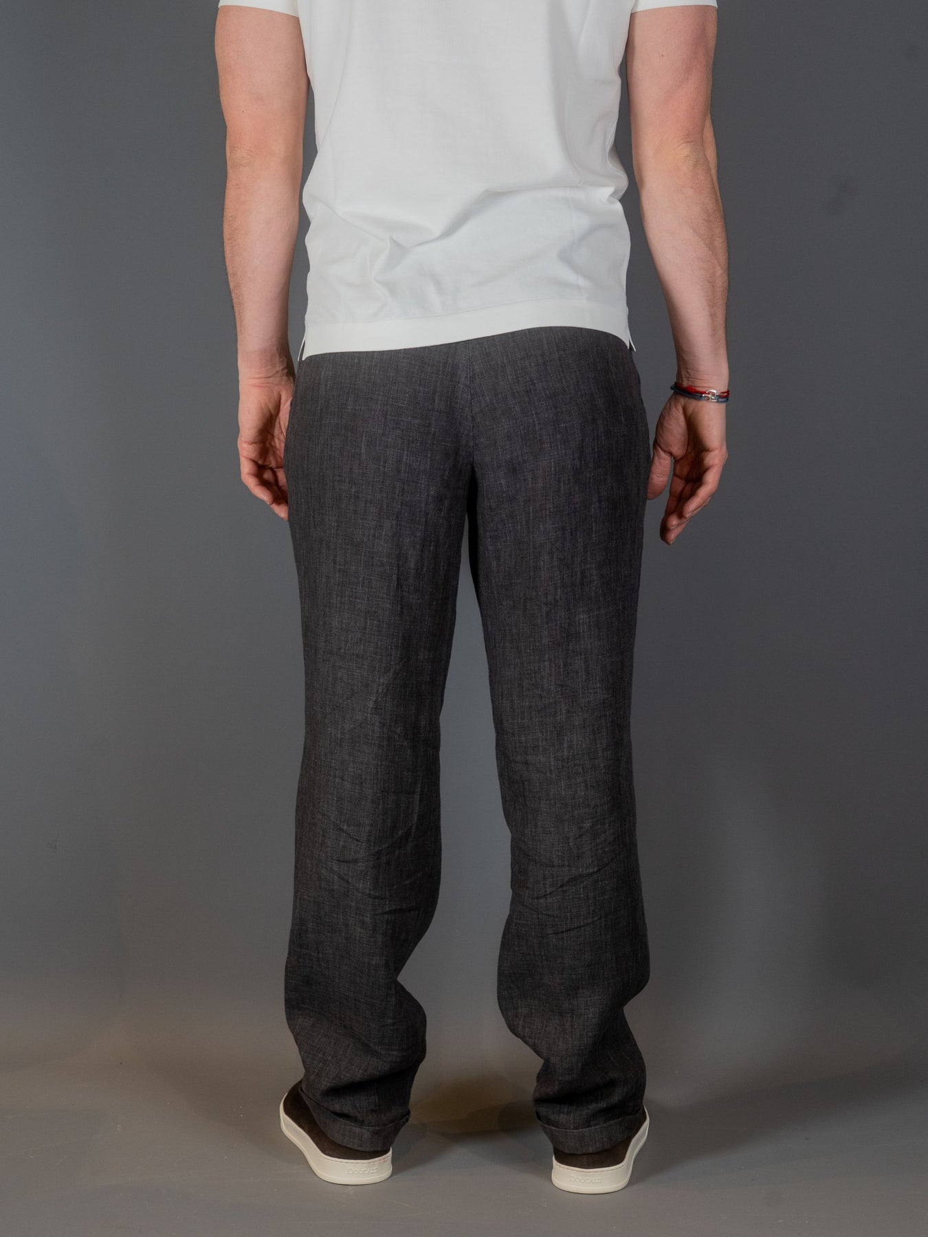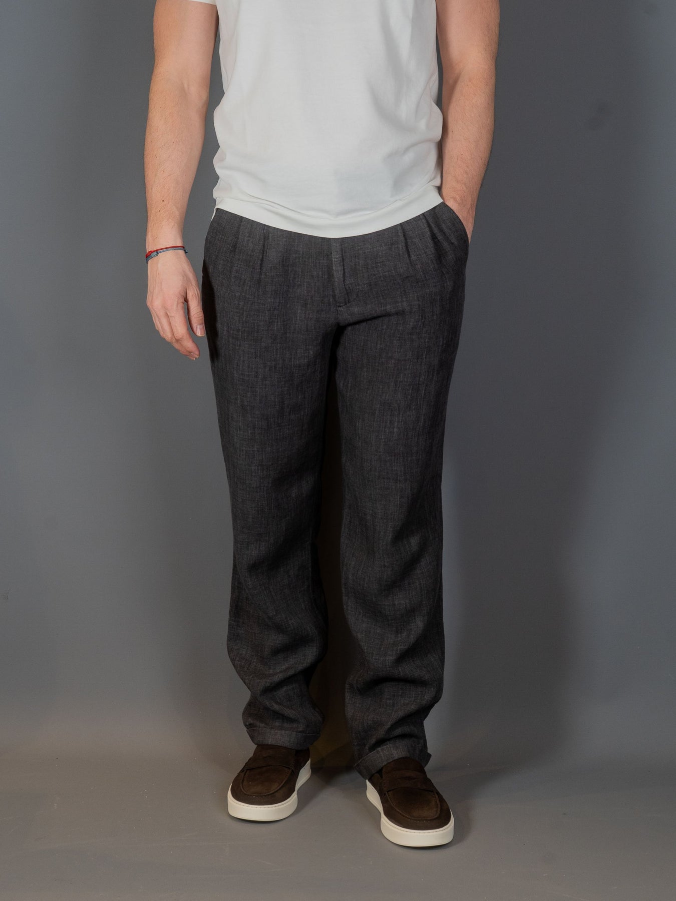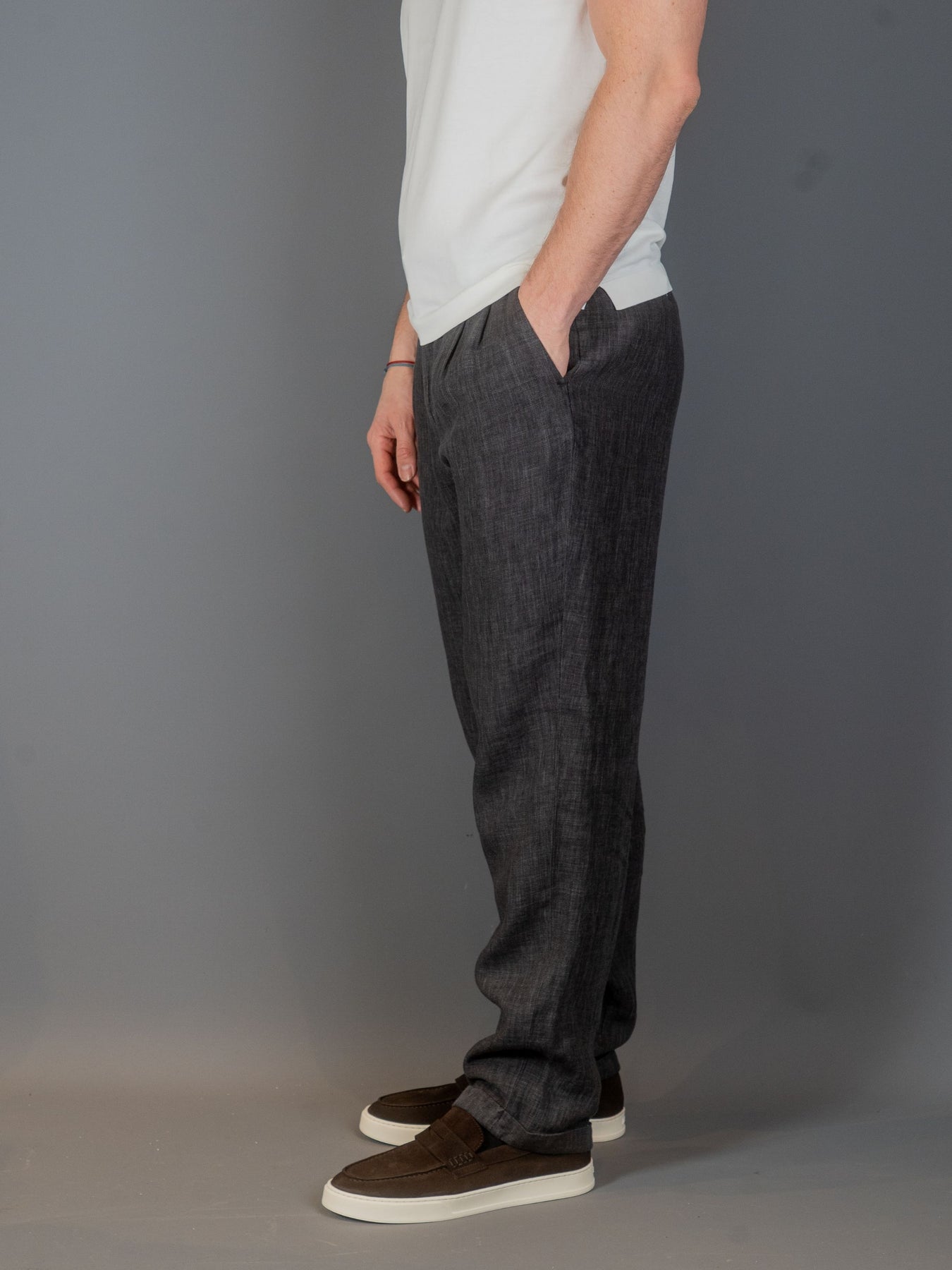 Disse bukser er lavet af grå blandet hør og viskose gabardin og har et minimalistisk design. Bukserne er mørkegrå med dobbelt plissering og bæltestropper, hvilket giver et poleret, rent udseende.