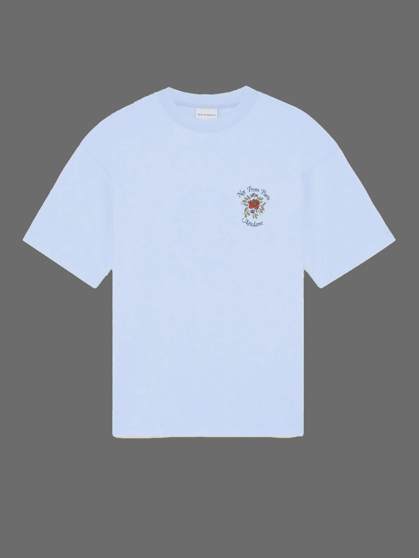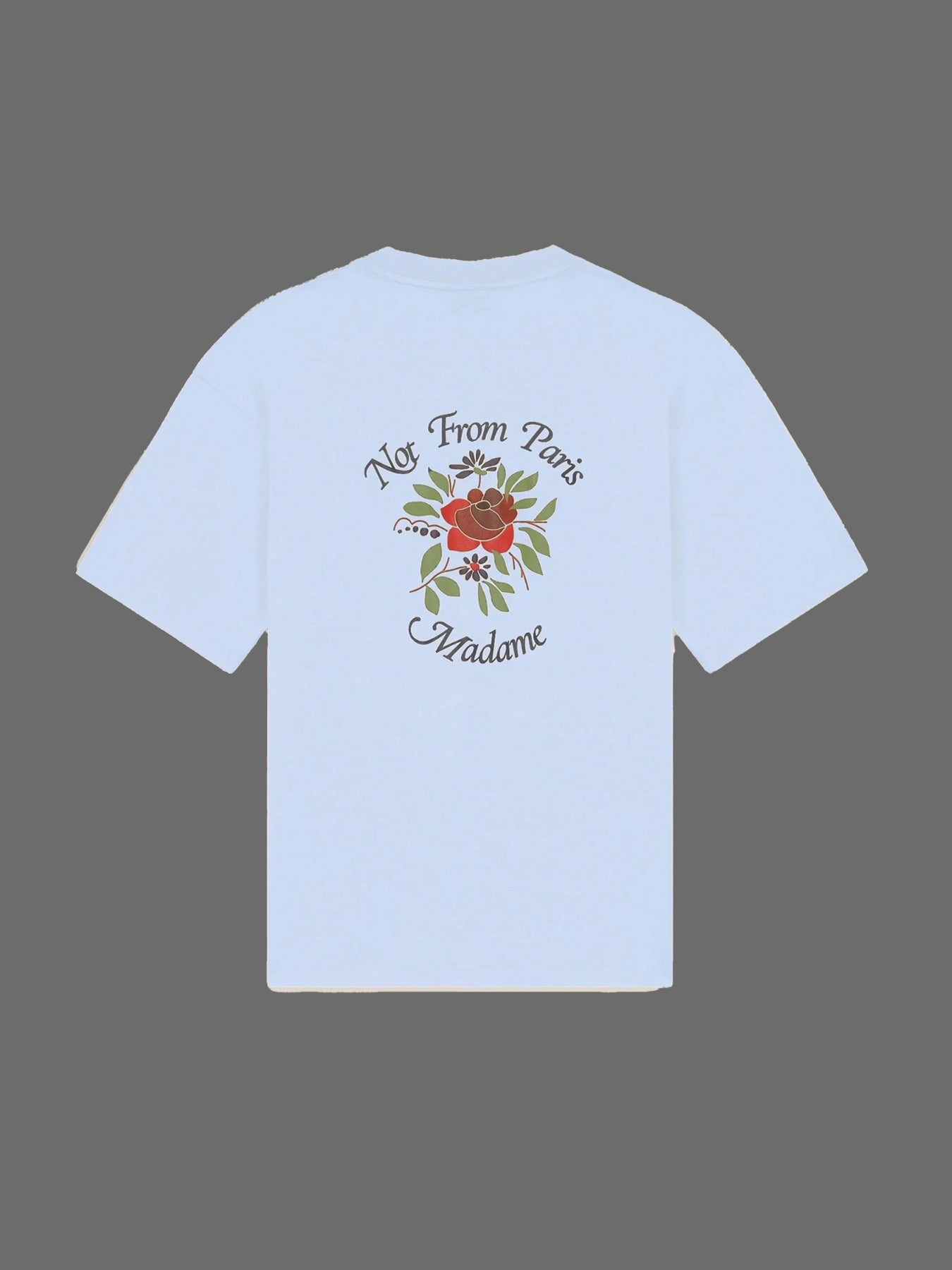 Denne lyseblå interlock-t-shirt i 100% bomuld med ribbet halsudskæring har et slogan-roseprint foran og bagpå.
