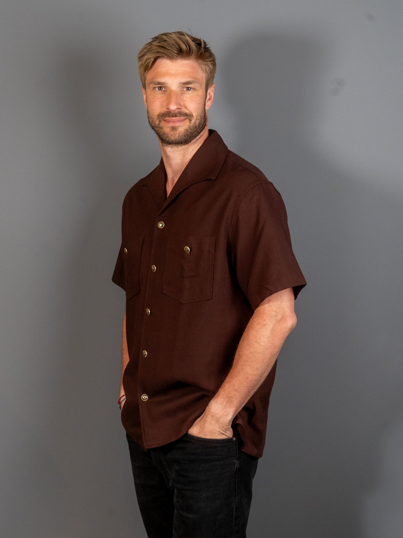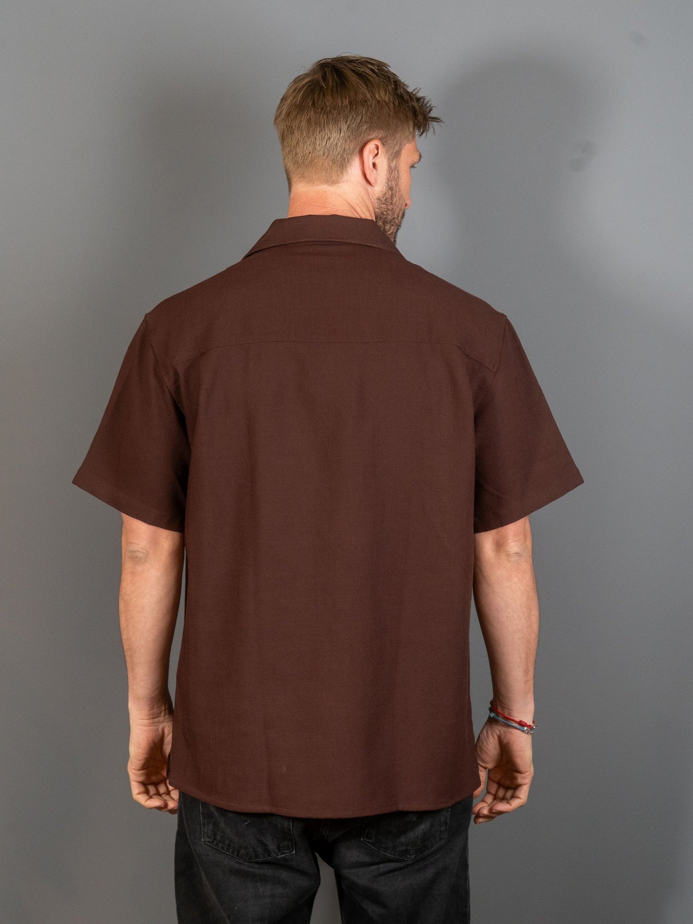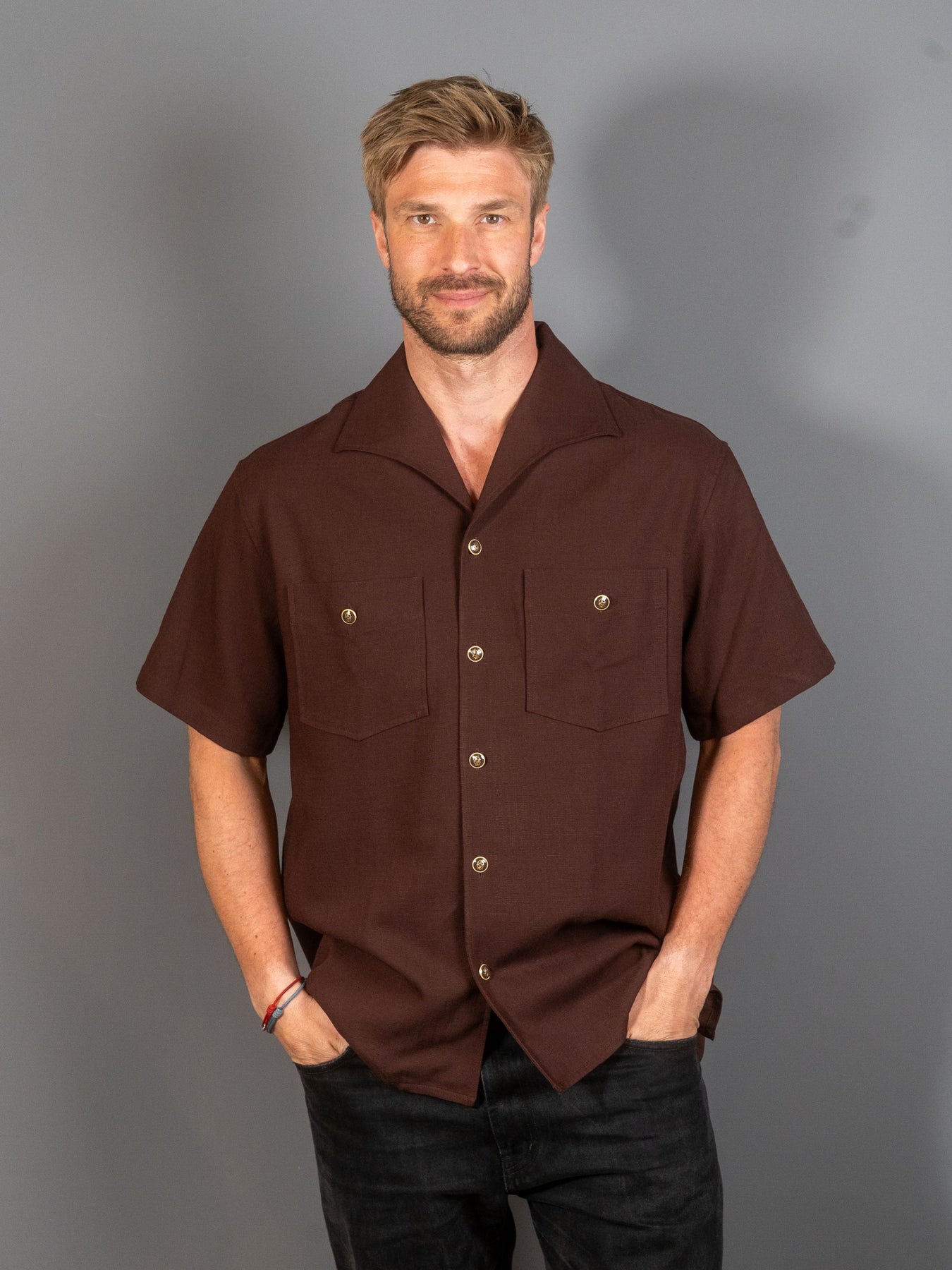 Denne brune kortærmede skjorte har en åben krave med hak, en enkeltradet lukning med fem knapper og påsyede lommer med knapper på brystet.