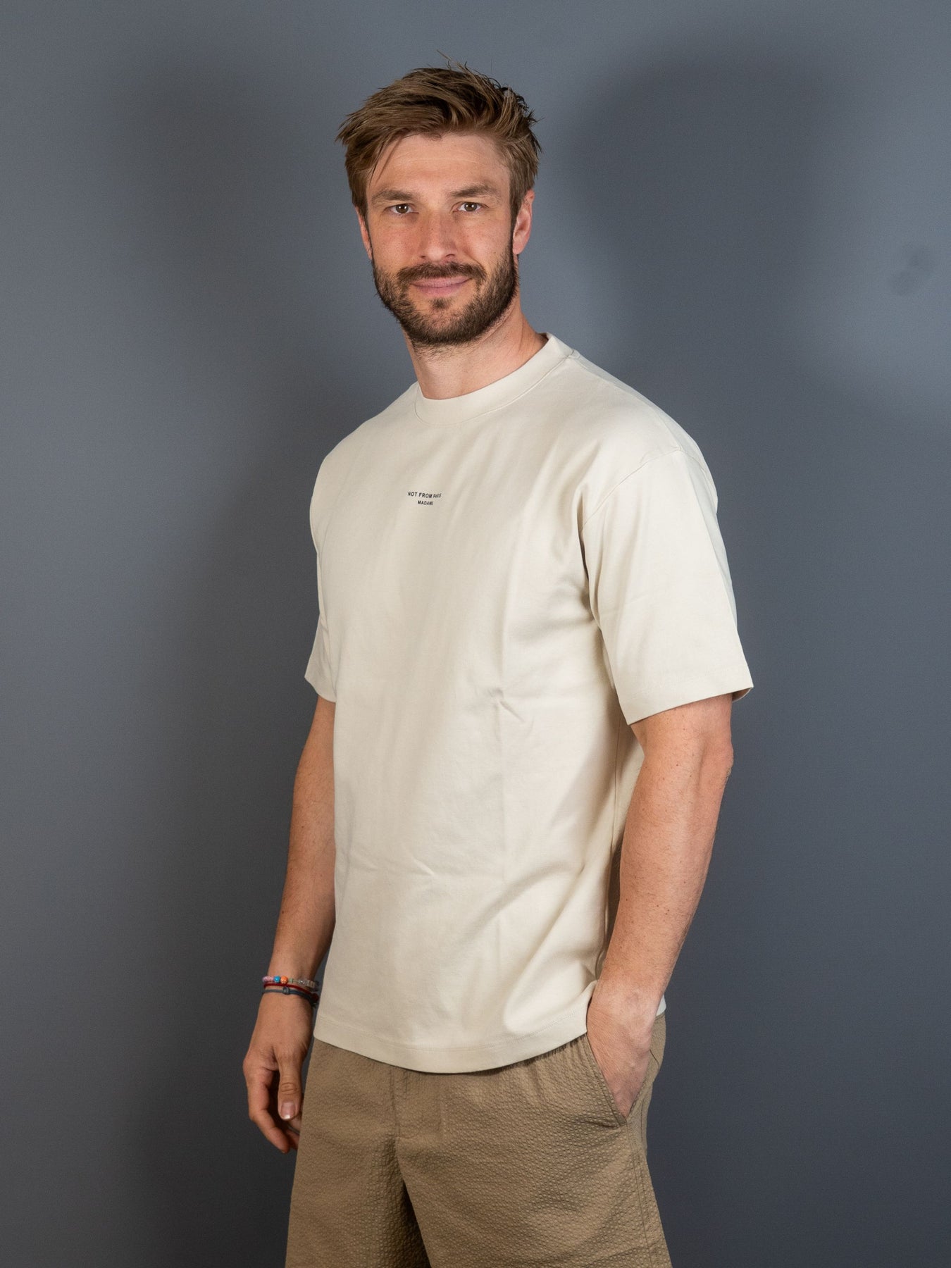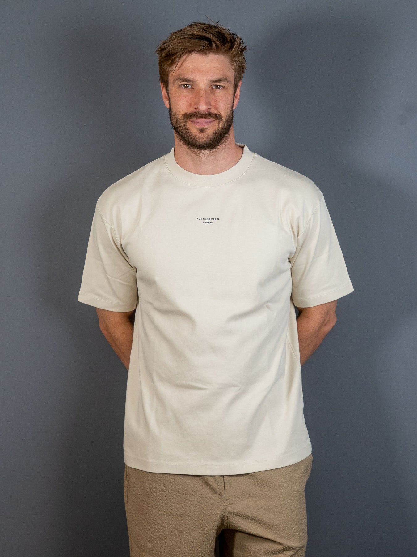 Interlock-t-shirt i 100% bomuld med ribbet halsudskæring er trykt med sloganet 'Not from Paris Madame'.