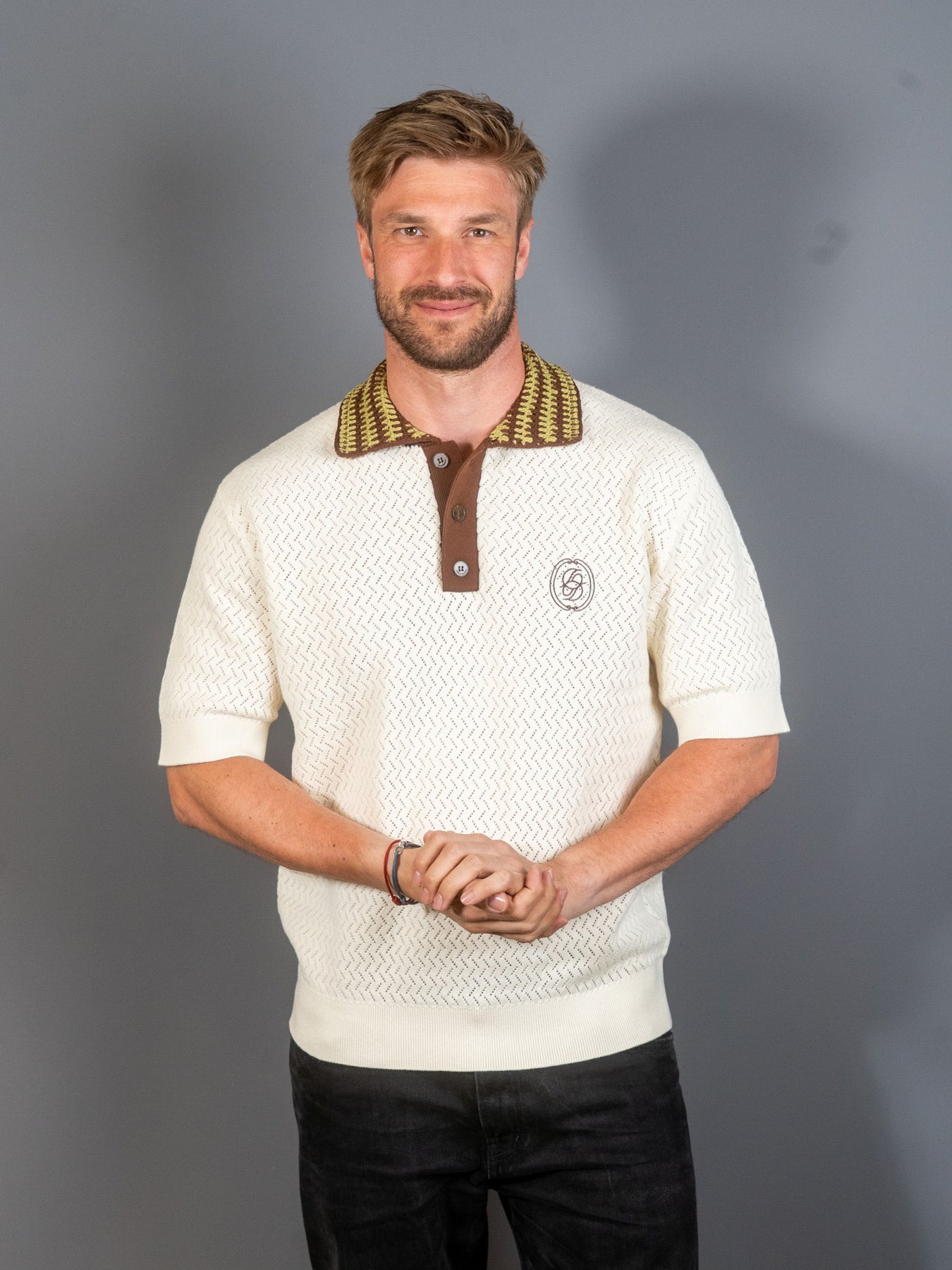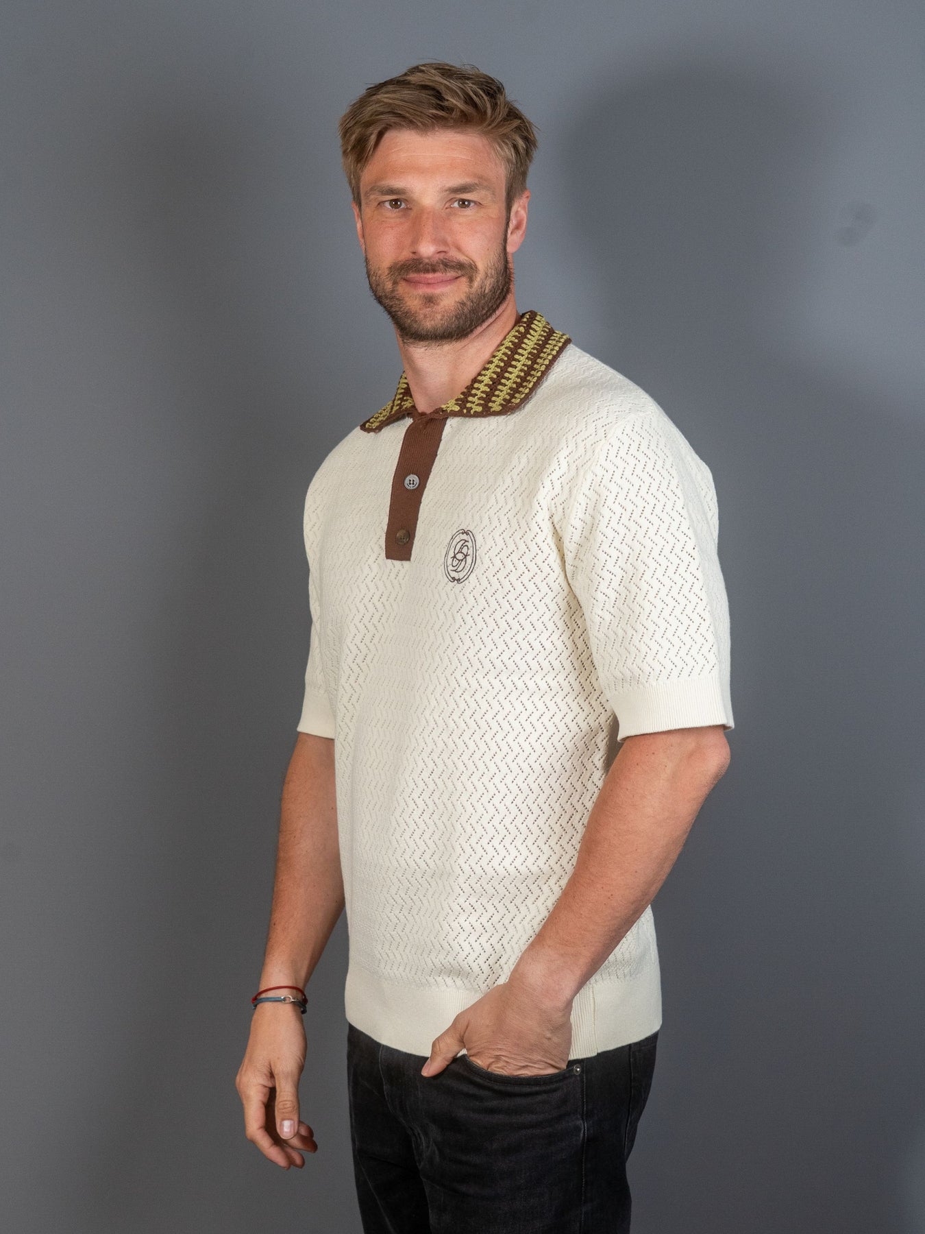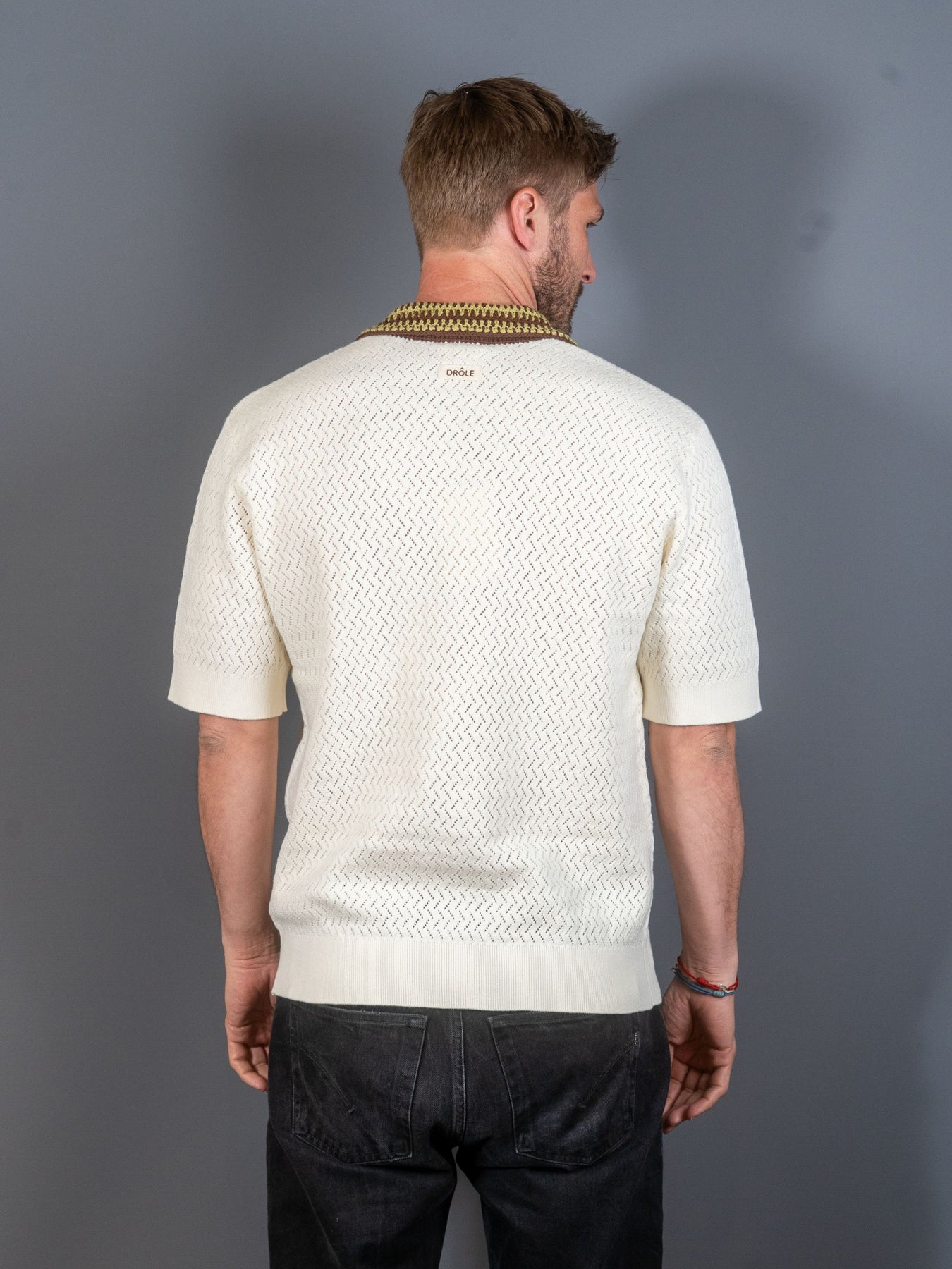 Denne off-white kortærmede poloshirt, lavet af 100% bomuldsstrik, har en hæklet krave, et spejlvendt 'D'-broderi på brystet og et 'Drôle'-mærke på bagsiden.