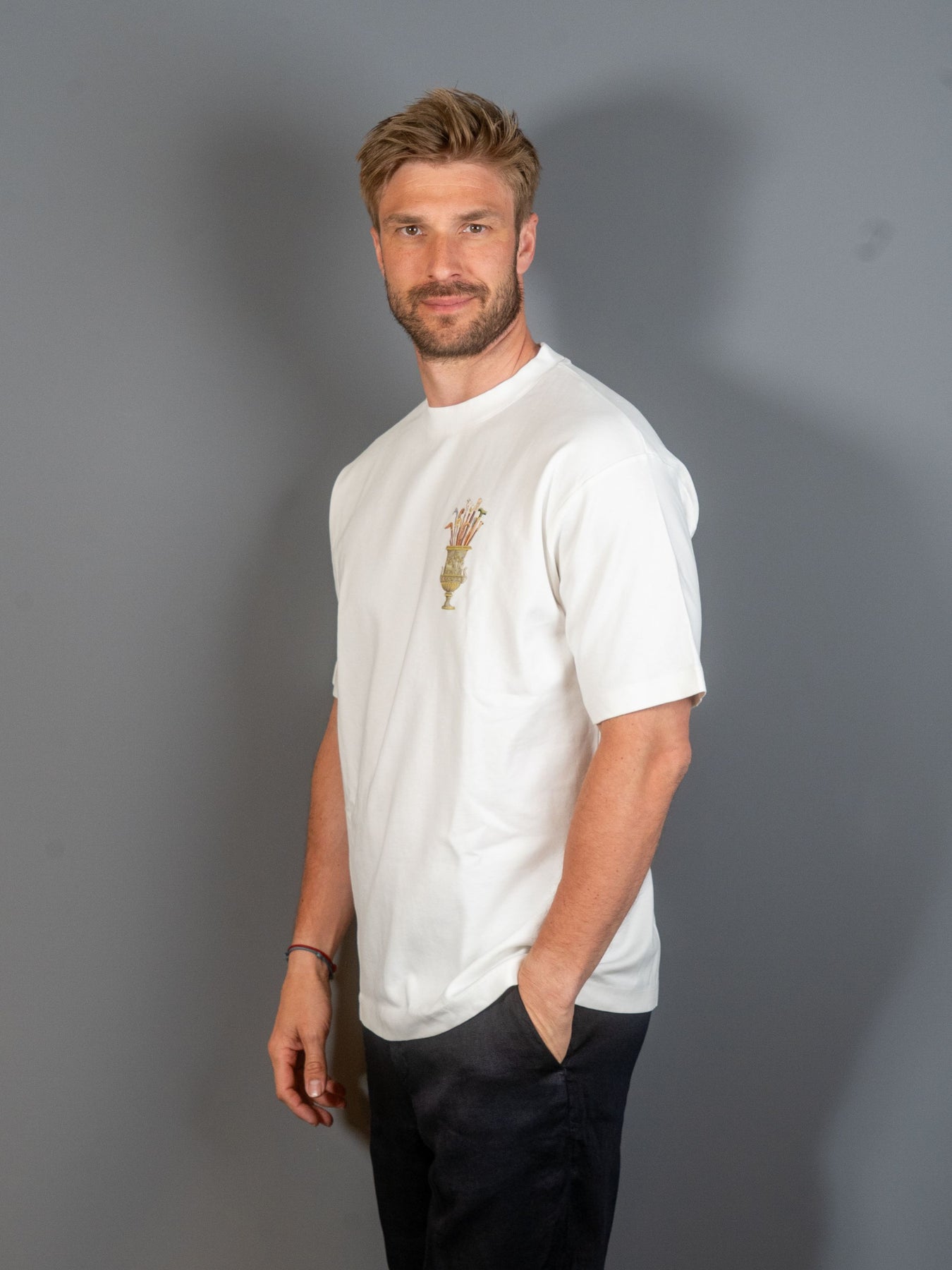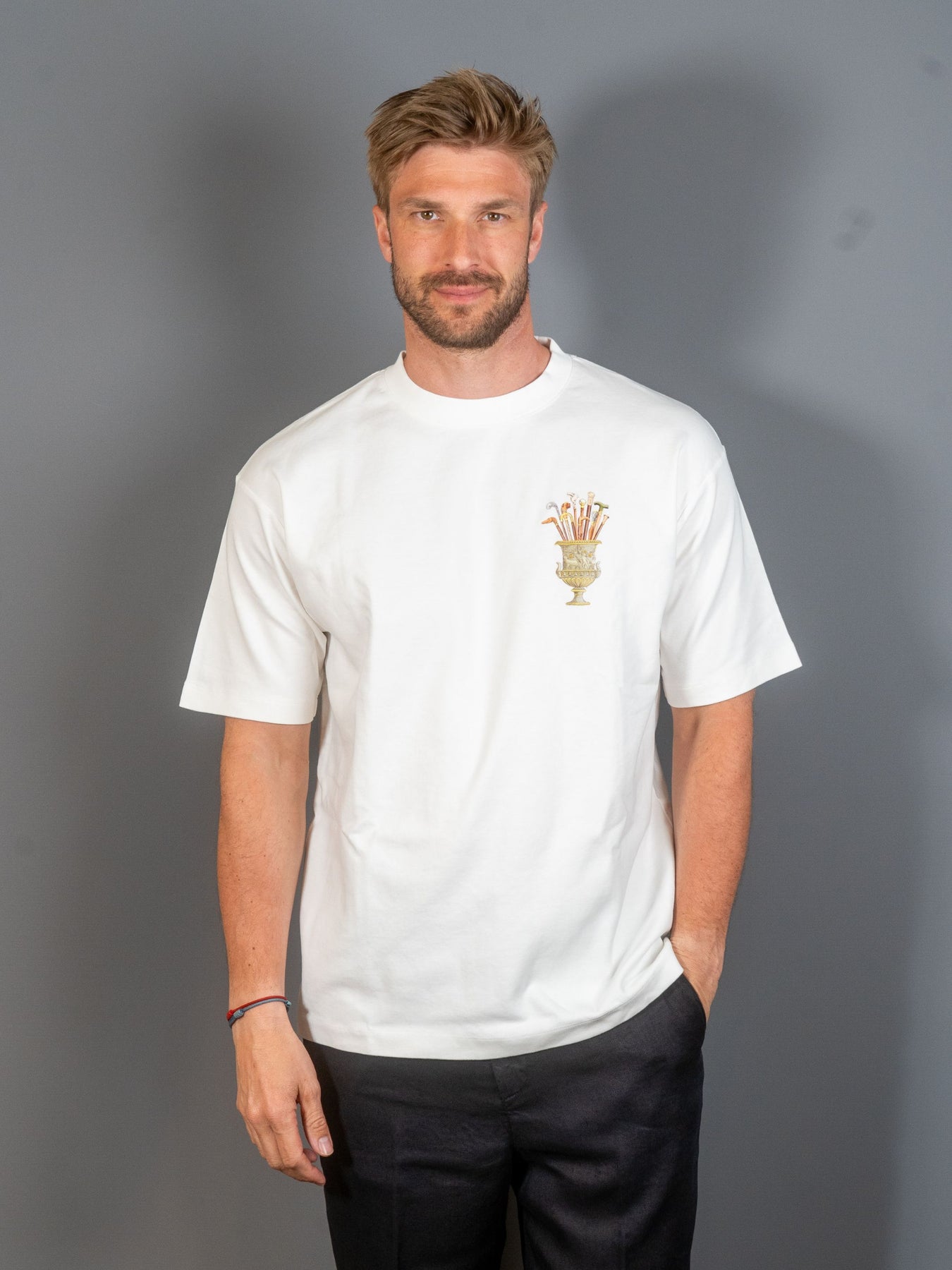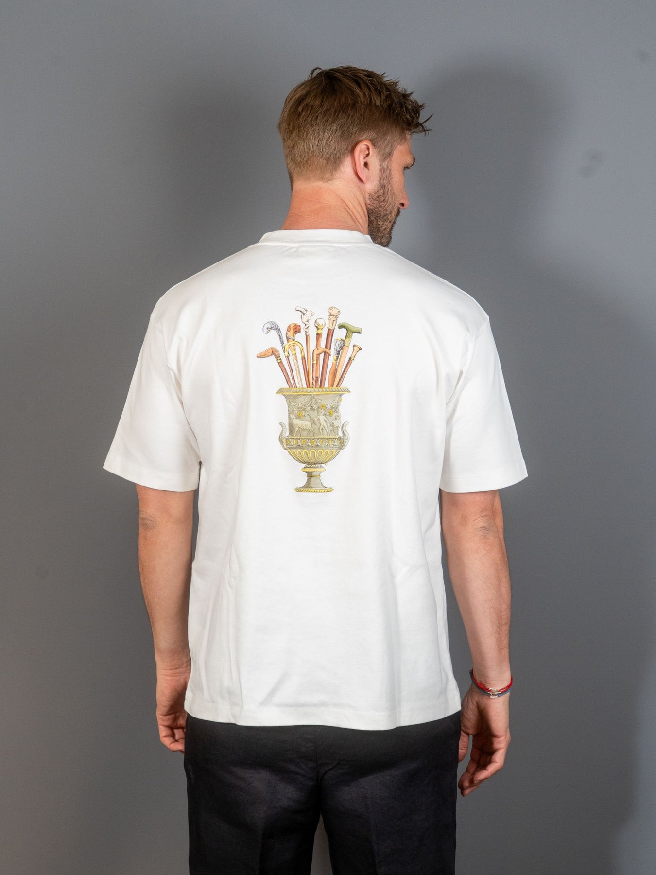 Denne off-white t-shirt i 100% bomuld med ribbet krave har et Vase Cannes-print foran og bagpå.