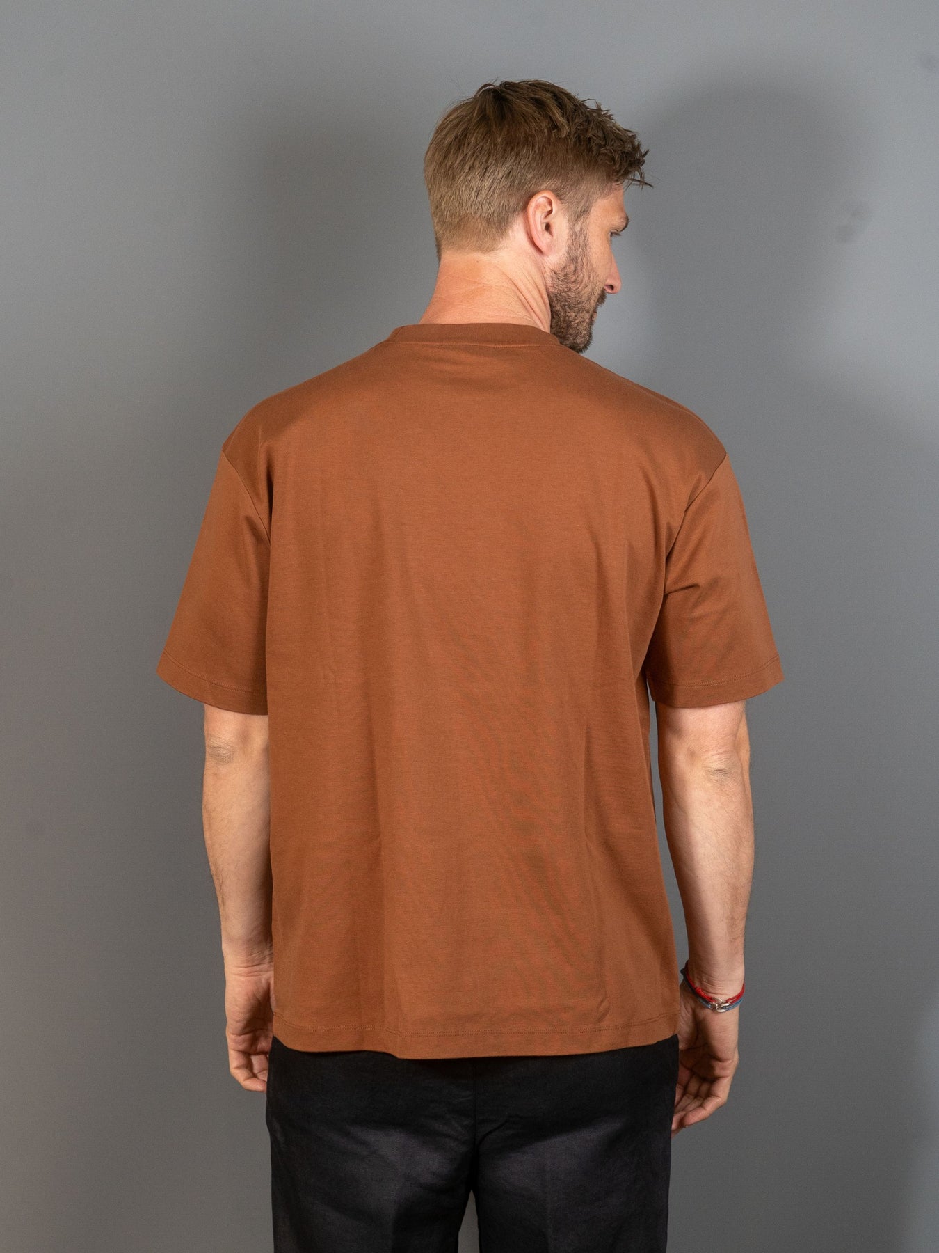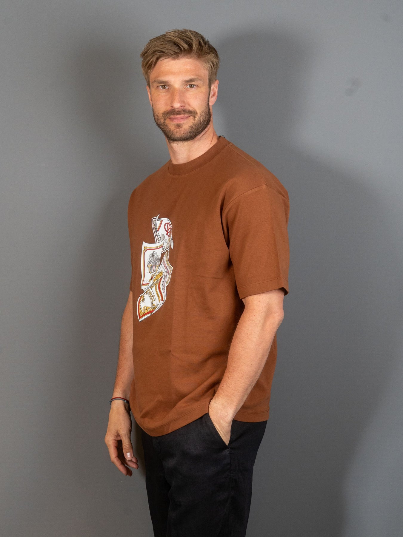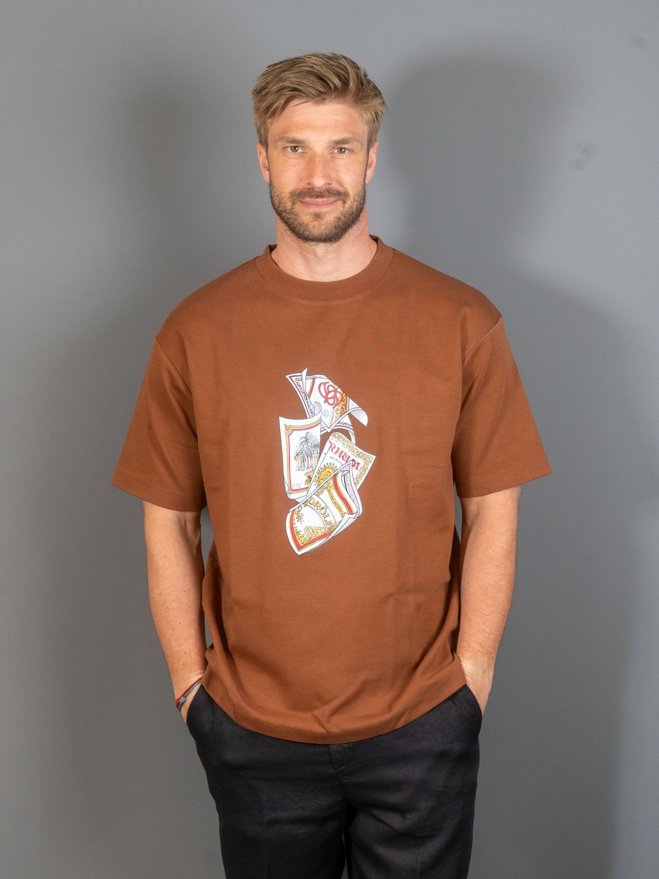 Denne brune t-shirt i 100% bomuld med ribbet krave har et Rum Labels-print foran.