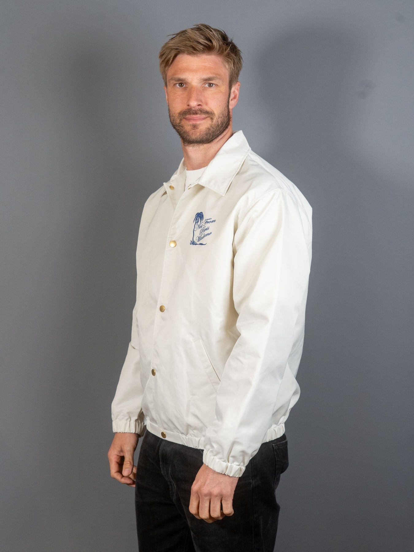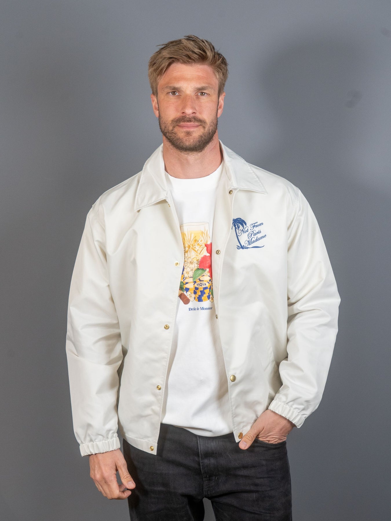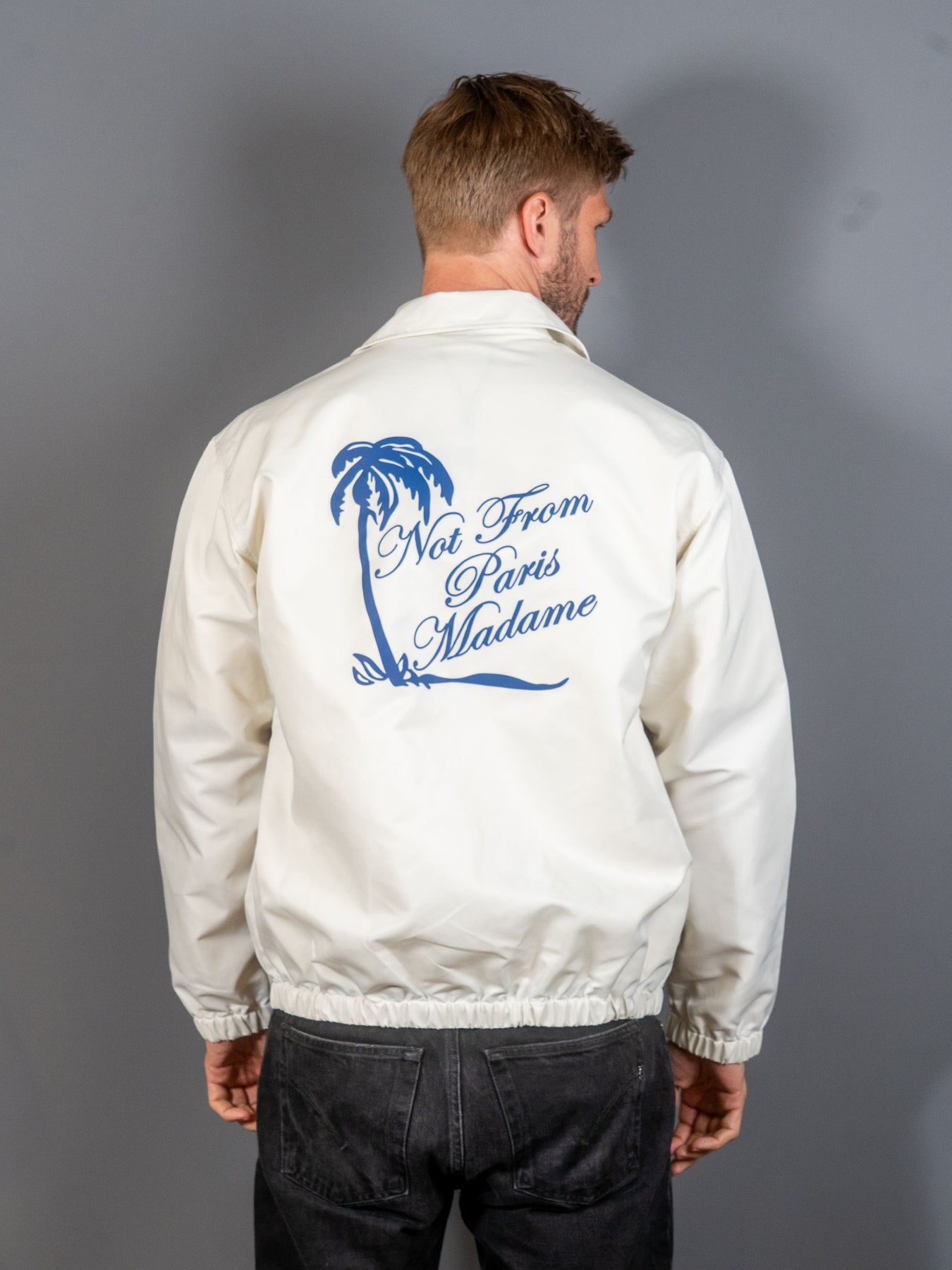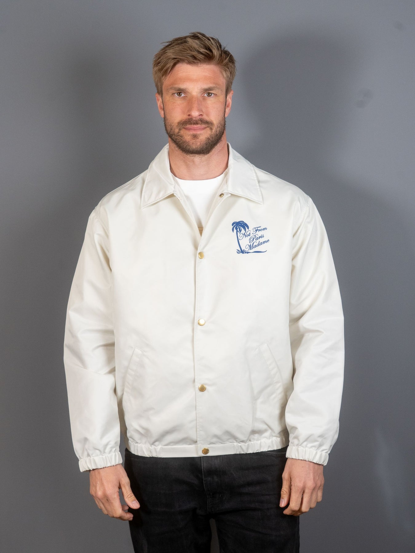 Denne lette, råhvide jakke, lavet af 100% nylon og uforet, har et slogan Palmier-print på bryst og ryg. Den har to paspolerede lommer, fem indgraverede trykknapper og elastiske manchetter og forneden.