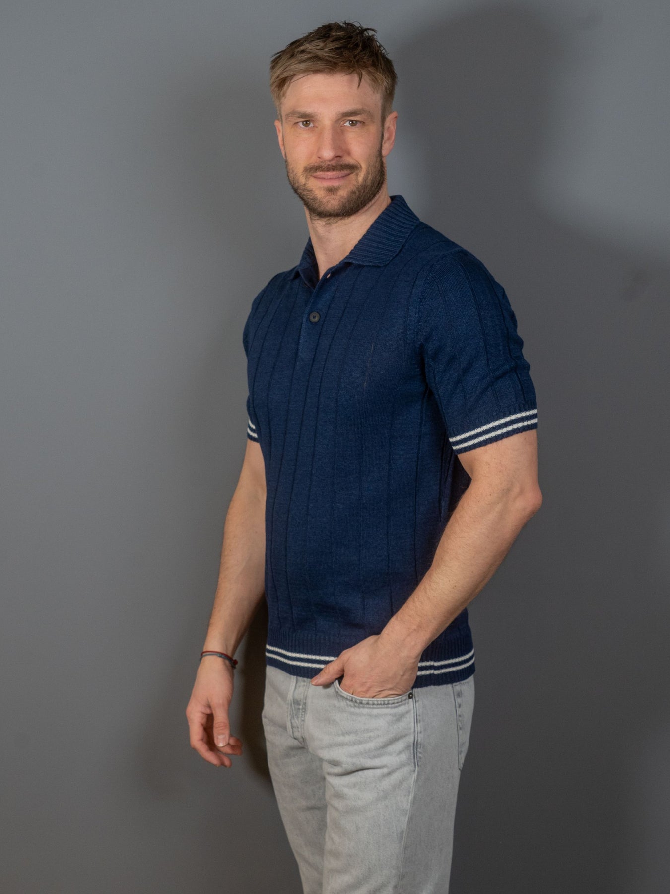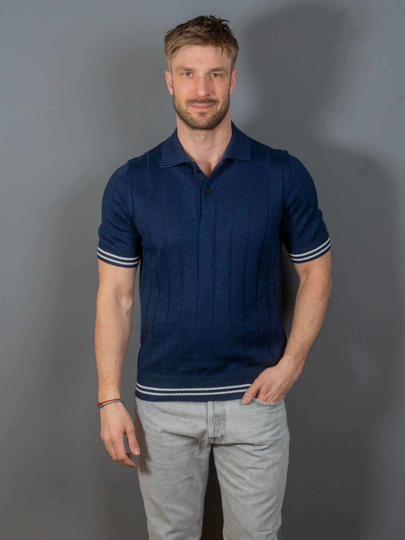 Ribbet 2-lags hør og kortærmet bomuldsstrikket skipper poloshirt fra italienske Gran Sasso. De kontrasterende detaljer på ærmerne og forneden giver en britisk flair.