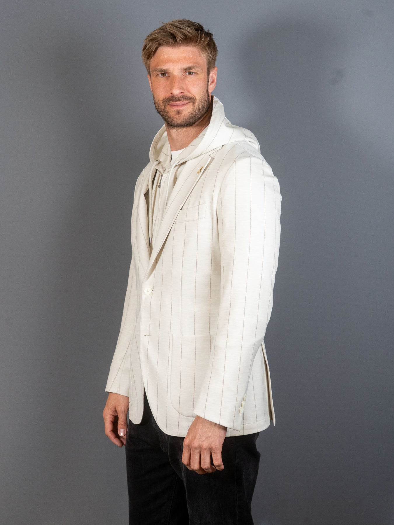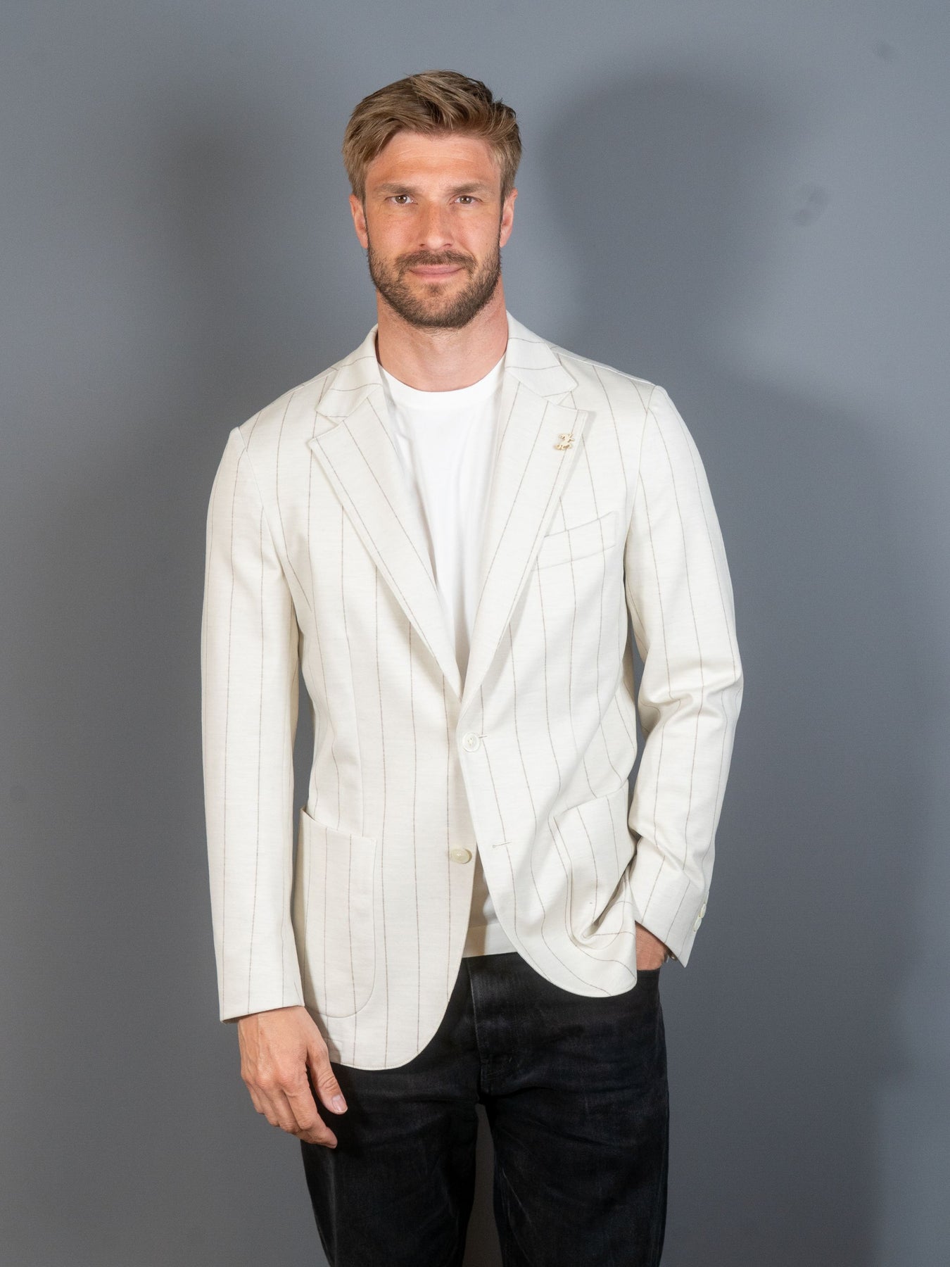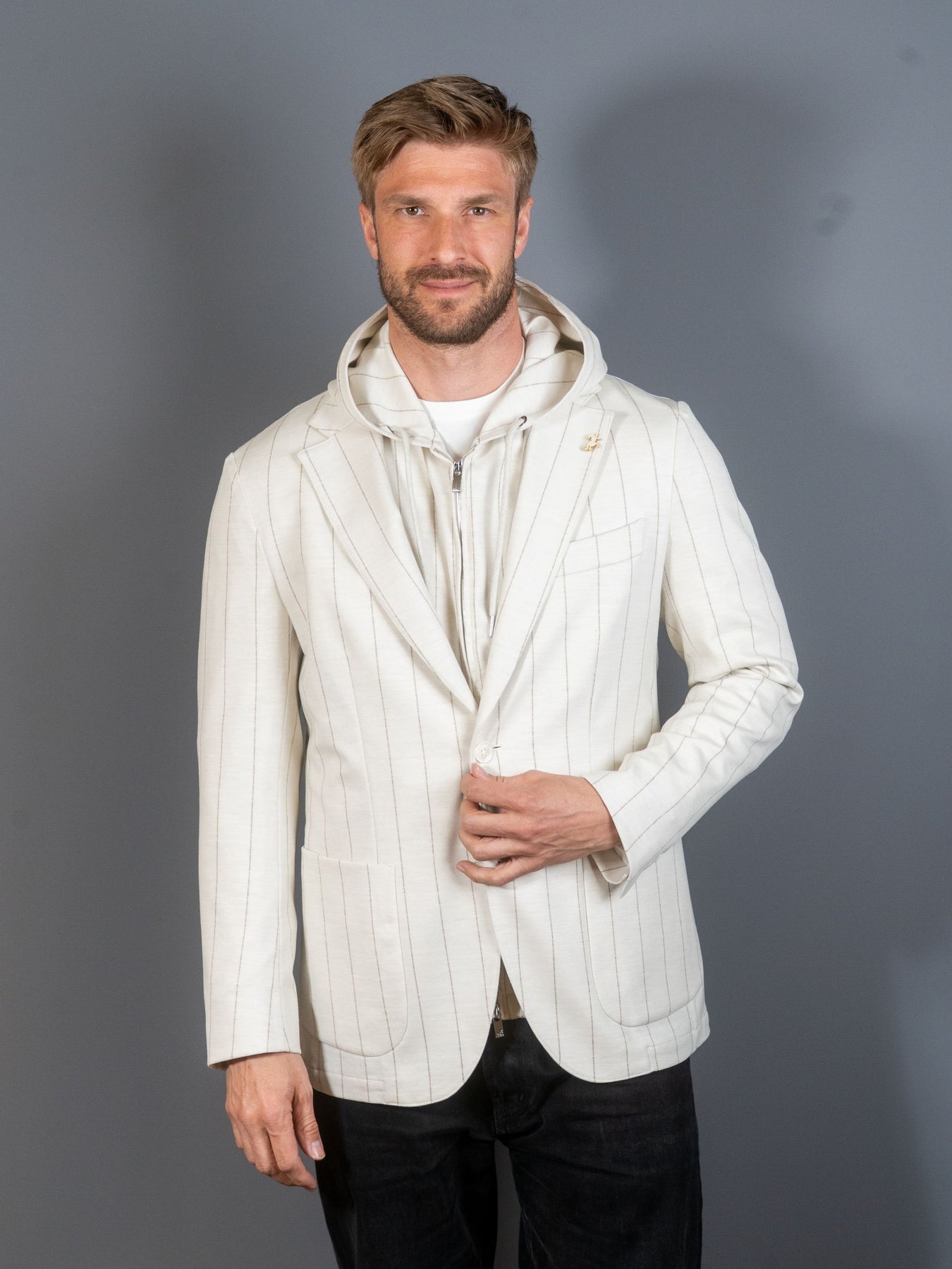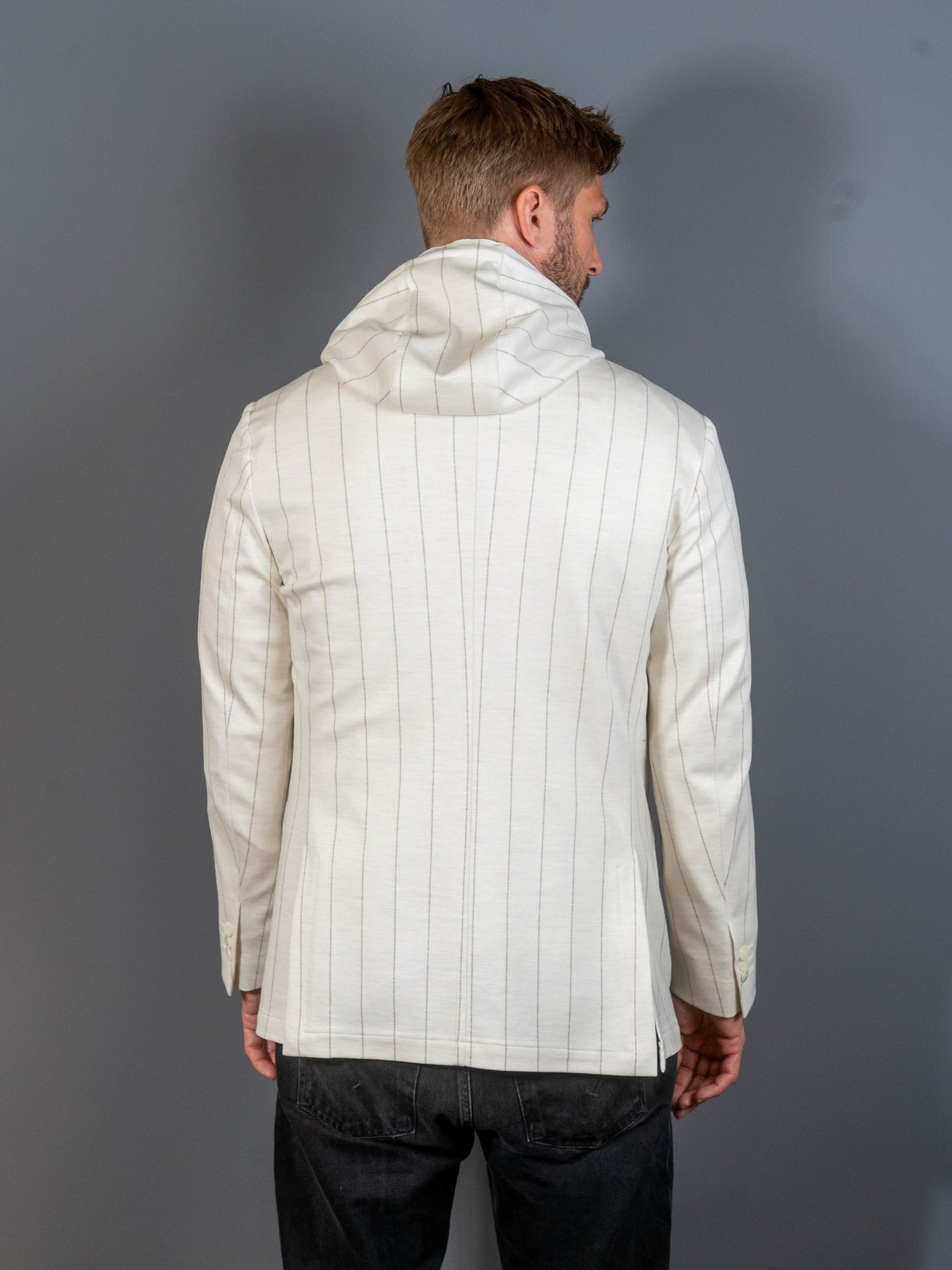 Stribet jersey blazer fra italienske Tombolini's Zero Gravity serie. Zero Gravity serien er anerkendt som den letter blazer i verden, og er derfor utroligt behagelig at bære.