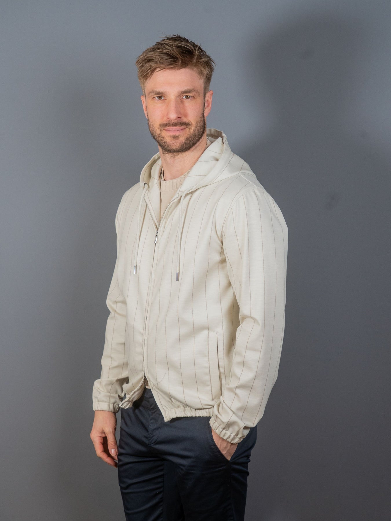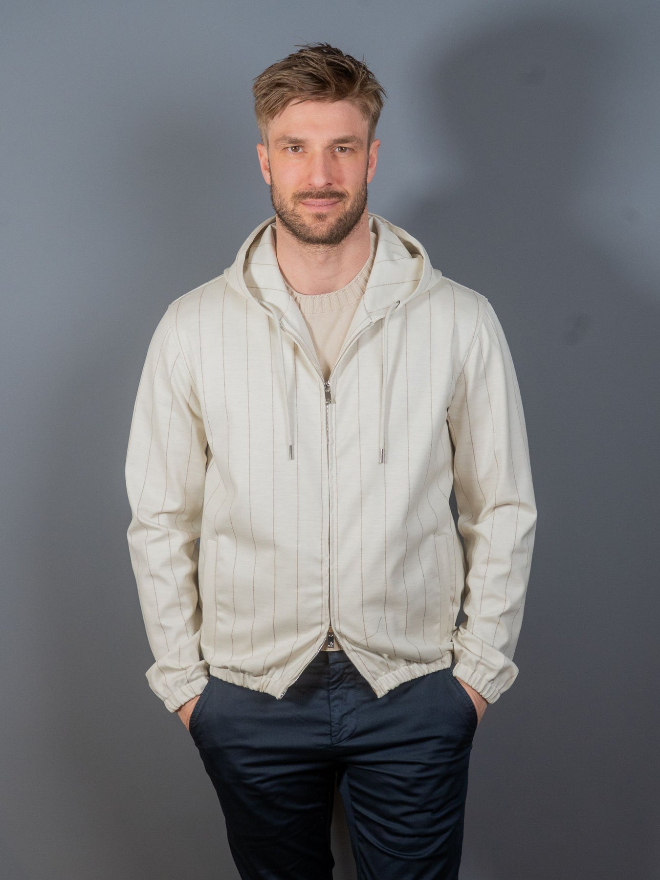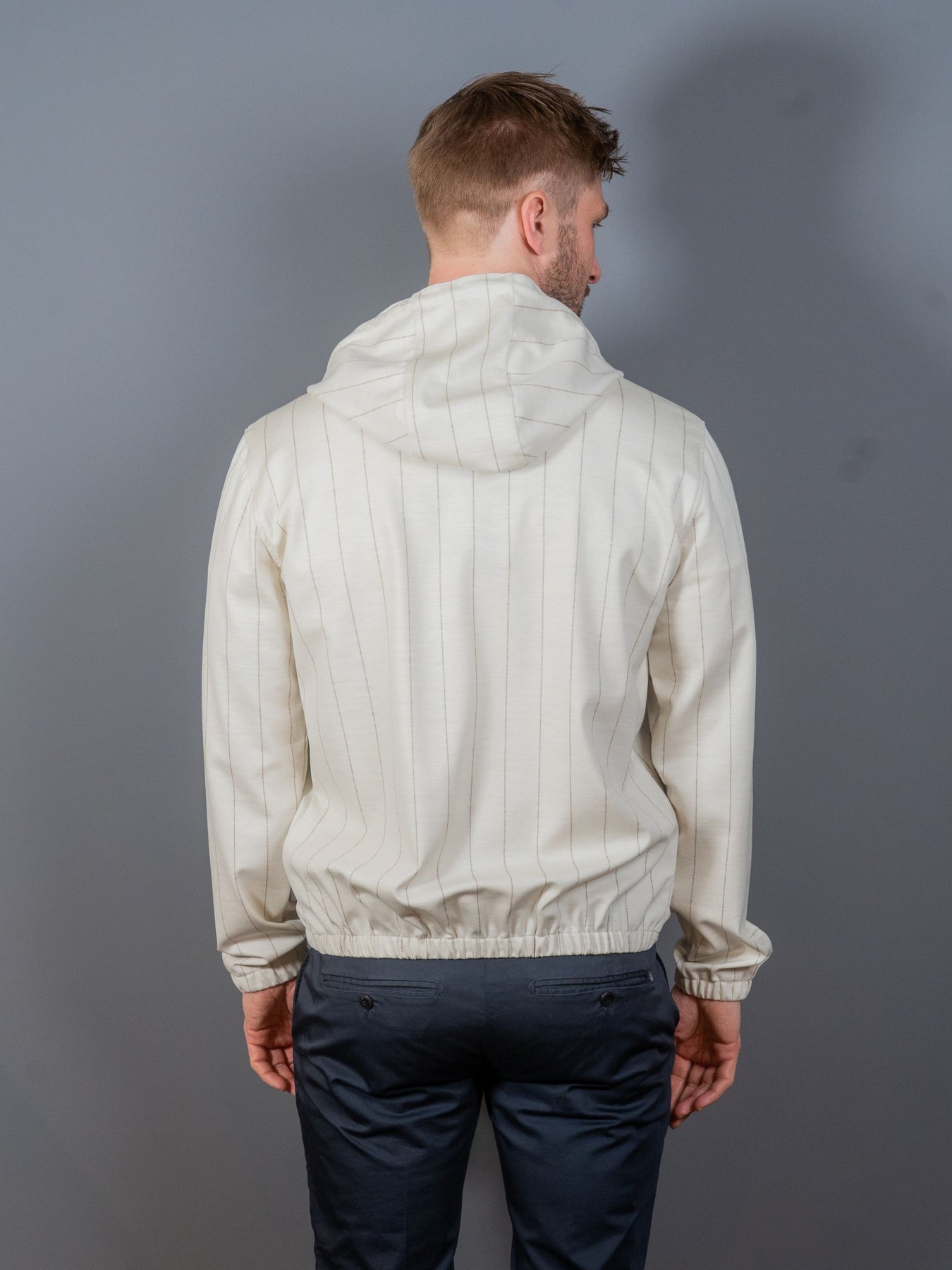 Stribet jersey hættetrøje i Loro Piana kvalitet fra italienske Tombolini's Zero Gravity serie. Zero Gravity serien er anerkendt som den letter blazer i verden, og er derfor utroligt behagelig at bære.