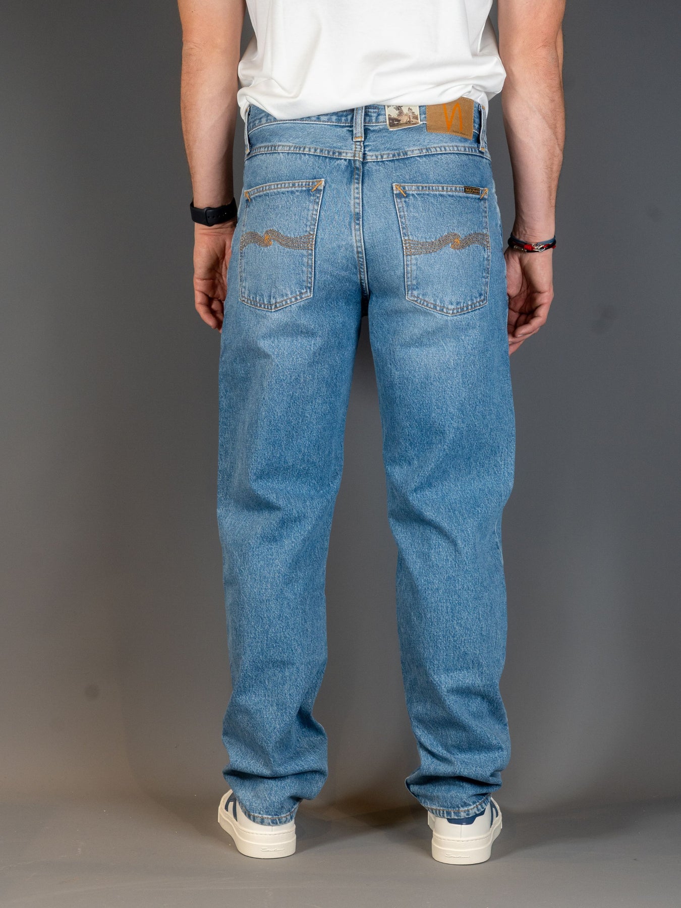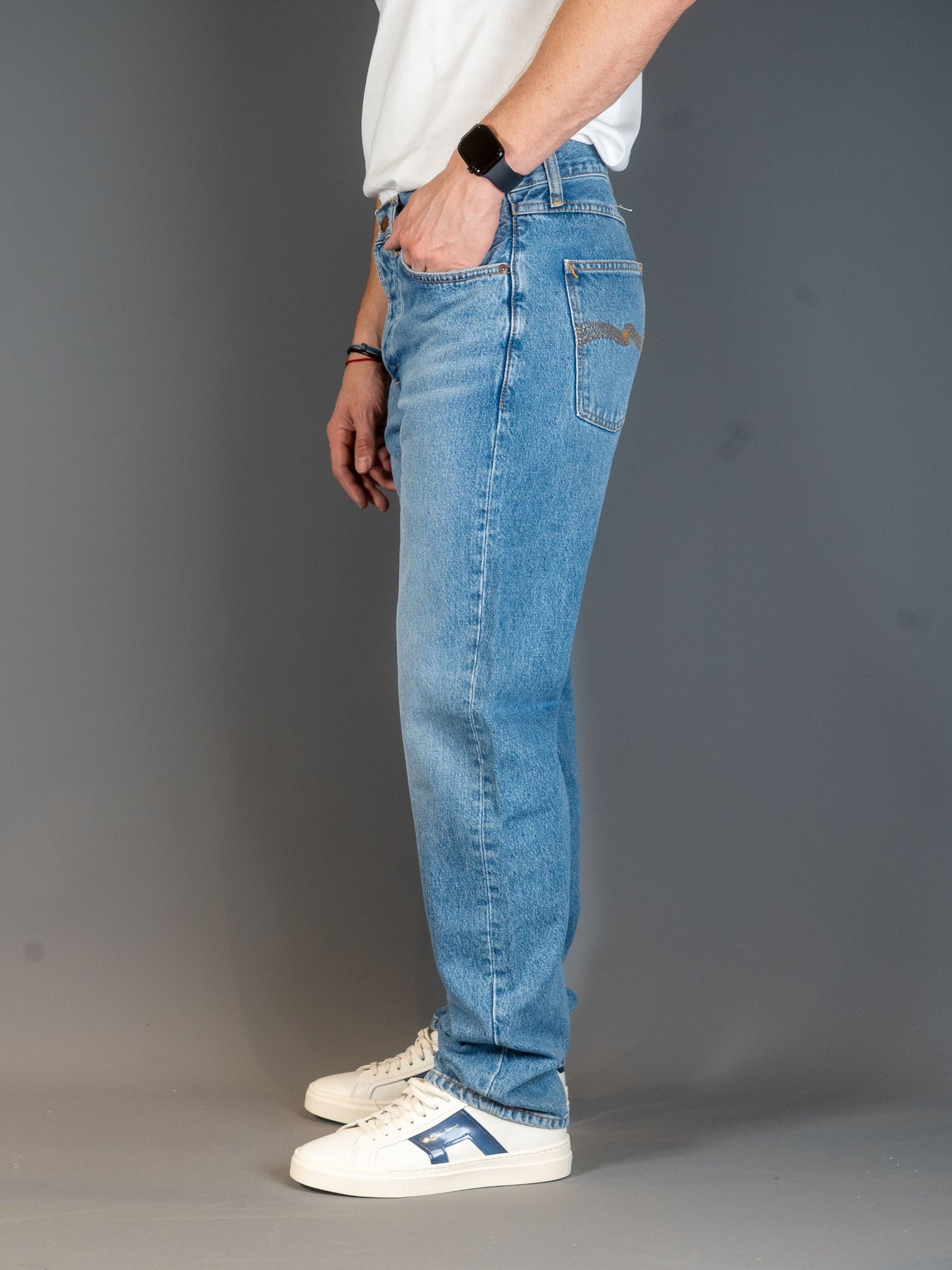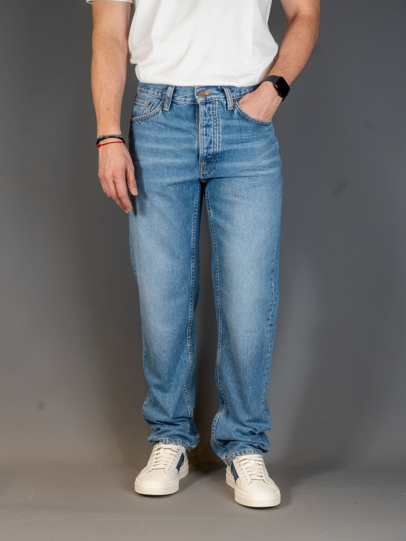 En højtaljet, regulær pasform med lige ben i en vintage-agtig mellemblå vask. Denne vask præsenterer et imponerende spektrum af indigo-nuancer, der spænder fra lys til mørkeblå, hvilket tilføjer dybde og karakter. Denimens tekstur er lige så bemærkelsesværdig og fremviser definerede twill-linjer og rige marmoreffekter. Den harmoniske balance mellem disse elementer skaber en samlet æstetik, der er virkelig fremragende.